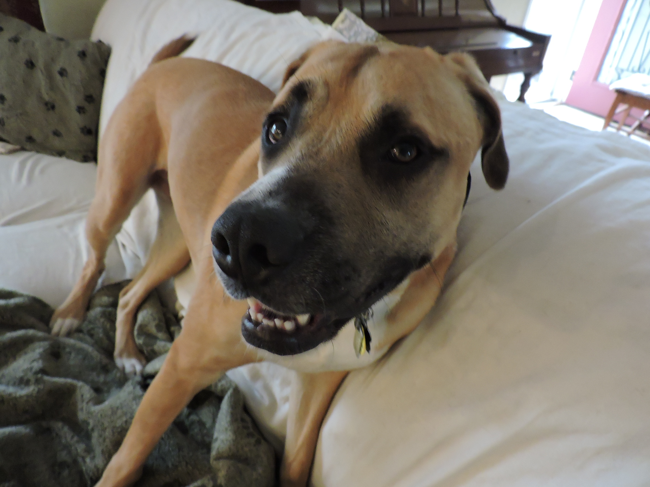Then there’s the evening routine. Since stairs are a potential landmine for recovery as dogs tend to jump up more than one stair at a time, and going down is equally harsh on a recovering bone, I have to carry him up and down. After the first day alone I realized that I could only do this once a day. This dog weighs 66 pounds on a good day. I am a middle aged woman who is in good physical condition and works out, but still . . . up stairs?? I developed a strategy for this as well. I put Shiloh on a chair in the living room, sit down next to him and get him on my lap, using my legs as leverage I push off, and carry him up stairs, down the hallway, and put him on my bed. Shiloh likes to be on the bed before we go to sleep, so if I don’t put him there, he will try to jump up. And jumping is bad for healing bones.