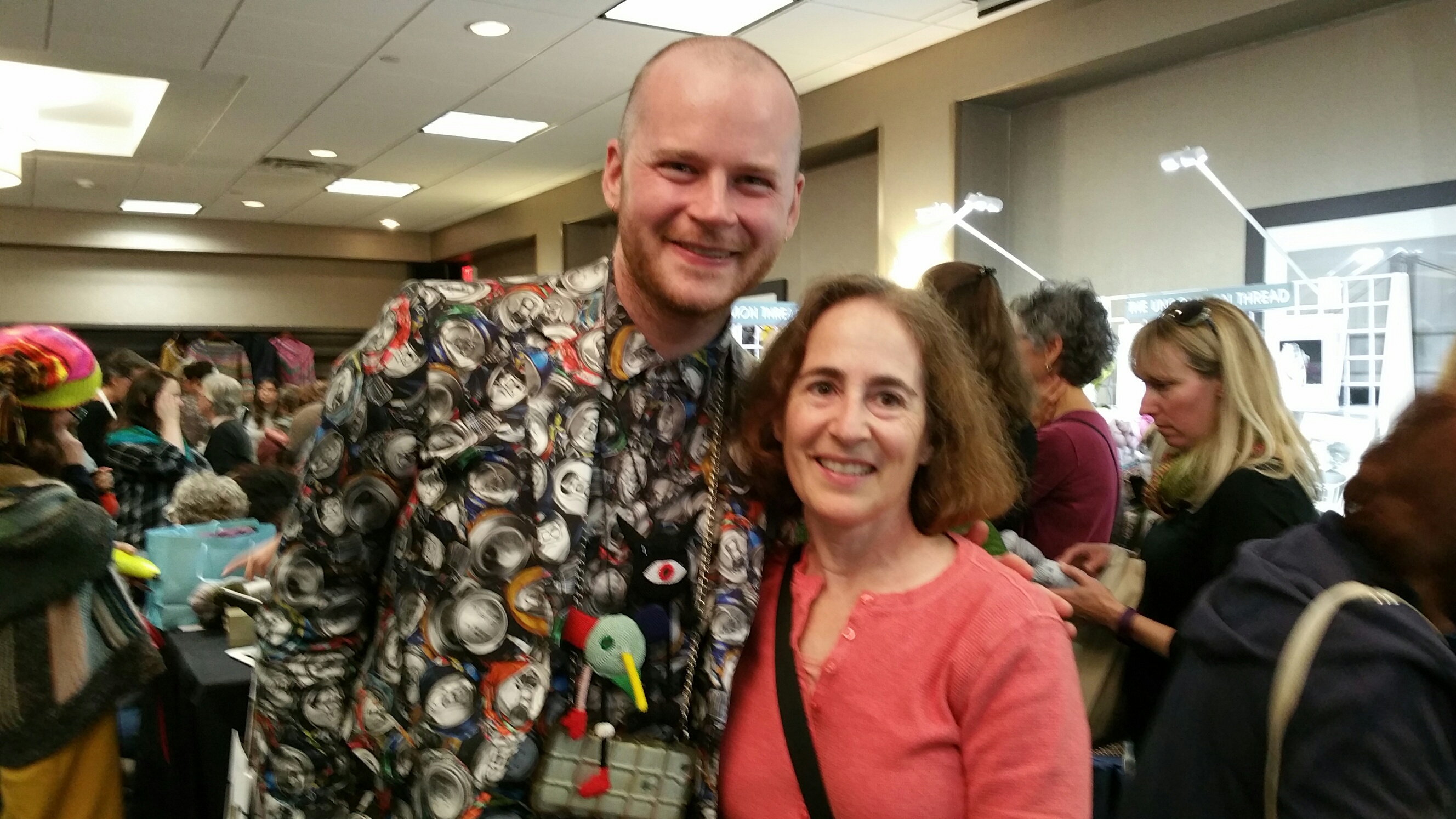 I went outside to catch up with Larry.  He was relaxing in the lobby with some knitters.  After joining them I learned that one of them, Anne, had met Stephen West in Rhinebeck village.  She took a selfie with him wearing hand knits.  Looking good Anne!