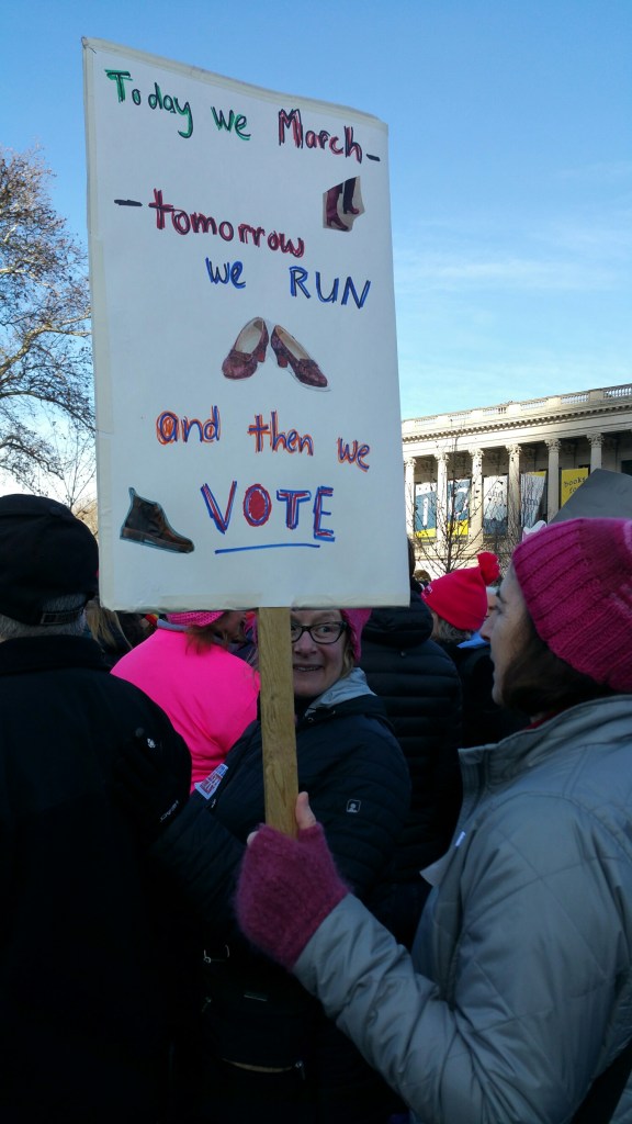 One of the themes of 2018 was to get more women elected to office. Change comes when people are willing to get out of their comfort zone, to give up a Saturday afternoon to make a difference. Last year we were angry; this year we were hopeful. Here I am with my sign!